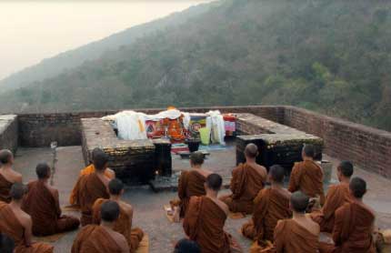The Vulture Peak, also known as the Holy Eagle Peak or Gridhrakūta, was, according to Buddhist tradition, the Buddha's favorite retreat in Rajagaha. It was the scene for many of his discourses. Rajgir is located in Bihar, India. It is so named because it resembles a sitting vulture with its wings folded.